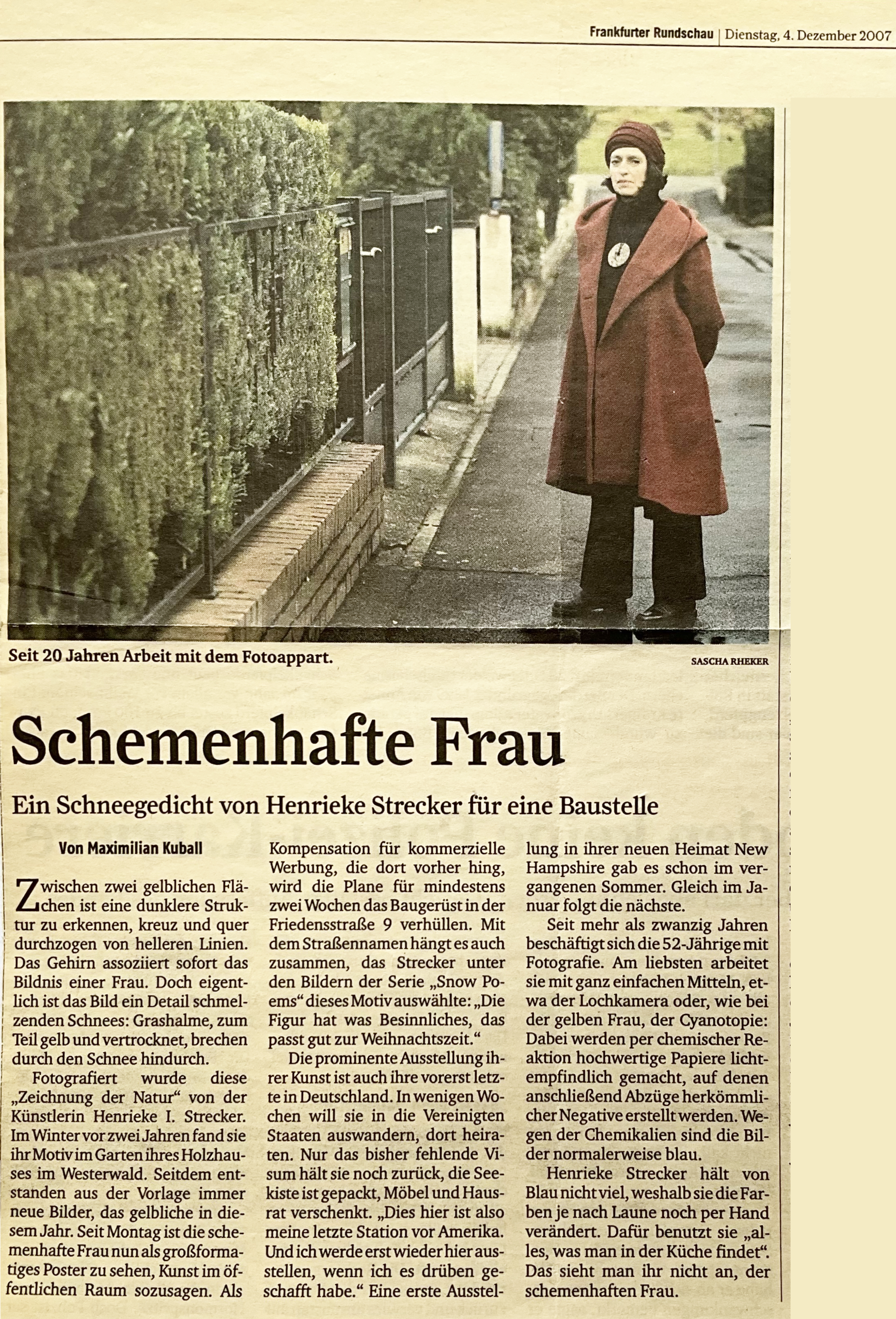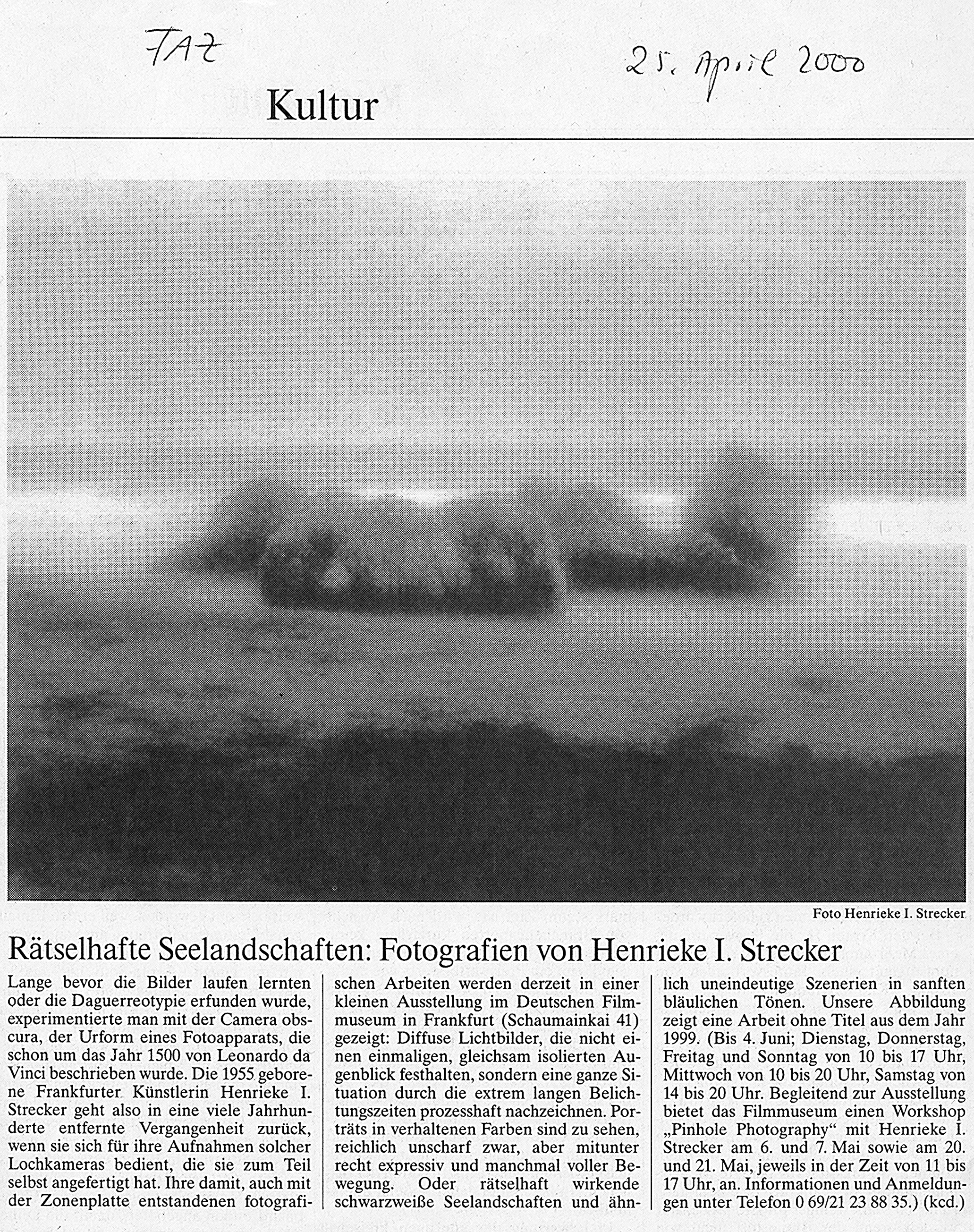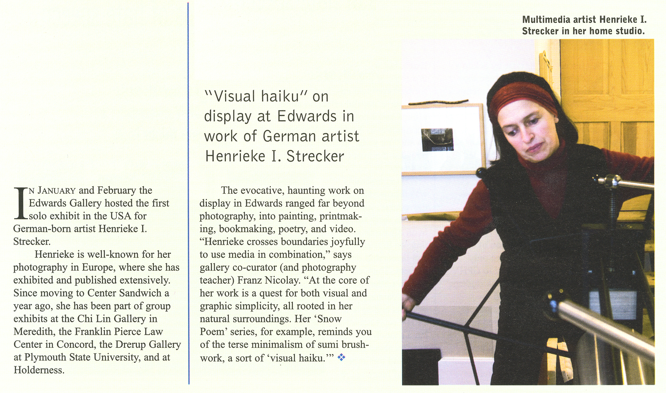 The evocative, haunting work on display in Edwards ranged far beyond photography, into painting, printmak- ing, bookmaking, poetry, and video. “Henrieke crosses boundaries joyfully to use media in combination,” says gallery co-curator (and photography teacher) Franz Nicolay. “At the core of her work is a quest for both visual and graphic simplicity, all rooted in her natural surroundings. Her ‘Snow Poem’ series, for example, reminds you of the terse minimalism of sumi brush work, a sort of ‘visual haiku’.”